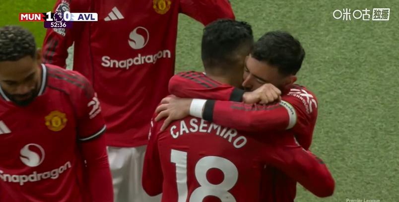 第53分钟,姆伯莫禁区内左侧小角度打门被大马丁飞身扑出底线,B费前场右侧开出角球,卡塞米罗迷踪步甩开防守,闪到前点甩头攻门将球顶进维拉大门,曼联主场1-0取得领先。这是胖虎本赛季第七粒英超联赛进球。